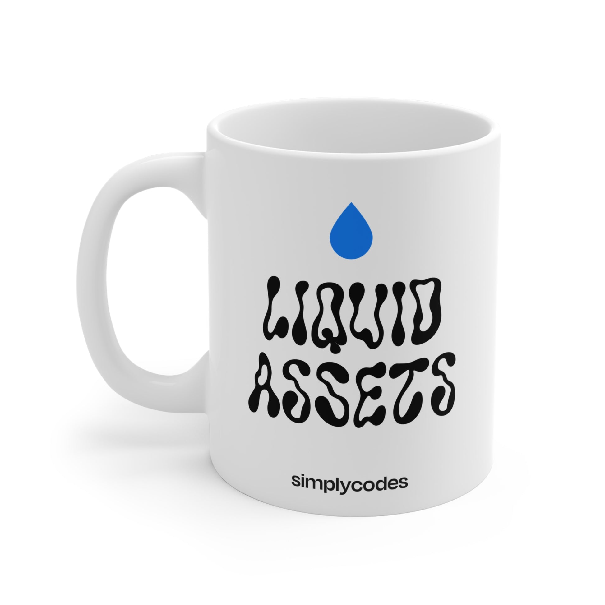 Sip your savings in style with our "Liquid Assets" mug. This clever design adds a touch of financial humor to your morning routine or office desk.